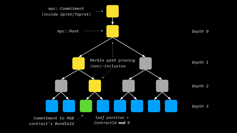<figure><img src="https://160813645-files.gitbook.io/~/files/v0/b/gitbook-x-prod.appspot.com/o/spaces%2FaUAGORrT1fl6qzaZSTKt%2Fuploads%2Fgit-blob-2953cbaeaf9f4ed5f01fa2785ac97ddccf104070%2Fimmagine%20(1).png?alt=media" alt=""><figcaption><p><strong>Each RGB contract has a unique position in the MPC Tree determined by a modular division applied to its ContractId according to the width of the tree. In this example, the MPC tree has a width of 8.</strong></p></figcaption></figure>