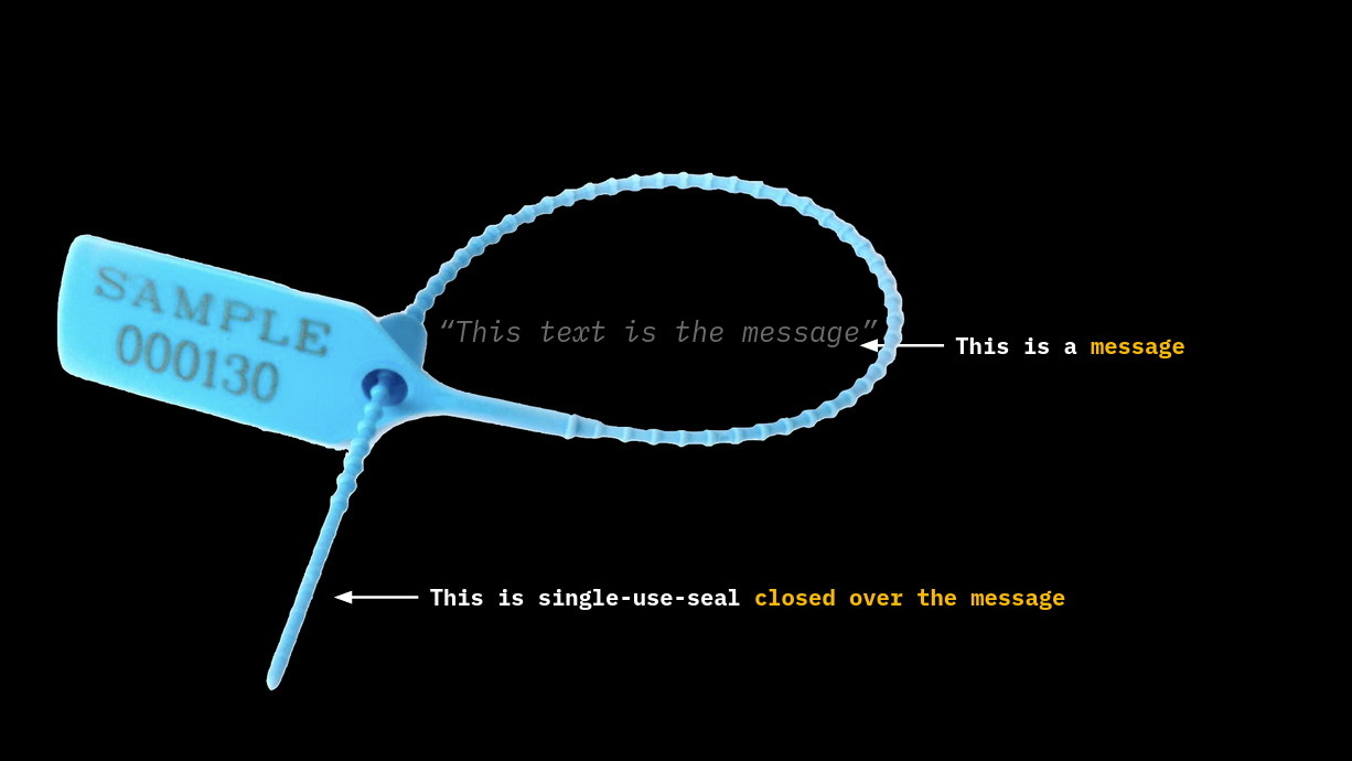 <figure><img src="https://160813645-files.gitbook.io/~/files/v0/b/gitbook-x-prod.appspot.com/o/spaces%2FaUAGORrT1fl6qzaZSTKt%2Fuploads%2Fgit-blob-6cf9a7985572c9d9aa15de7bd16314a8078dc3bd%2Fclosed-single-use-seal.png?alt=media" alt=""><figcaption><p><strong>By closing a message with a single-use seal, such message cannot be altered. In it's digital form, inscribed in Layer 1, the seal cannot be opened any more.</strong></p></figcaption></figure>